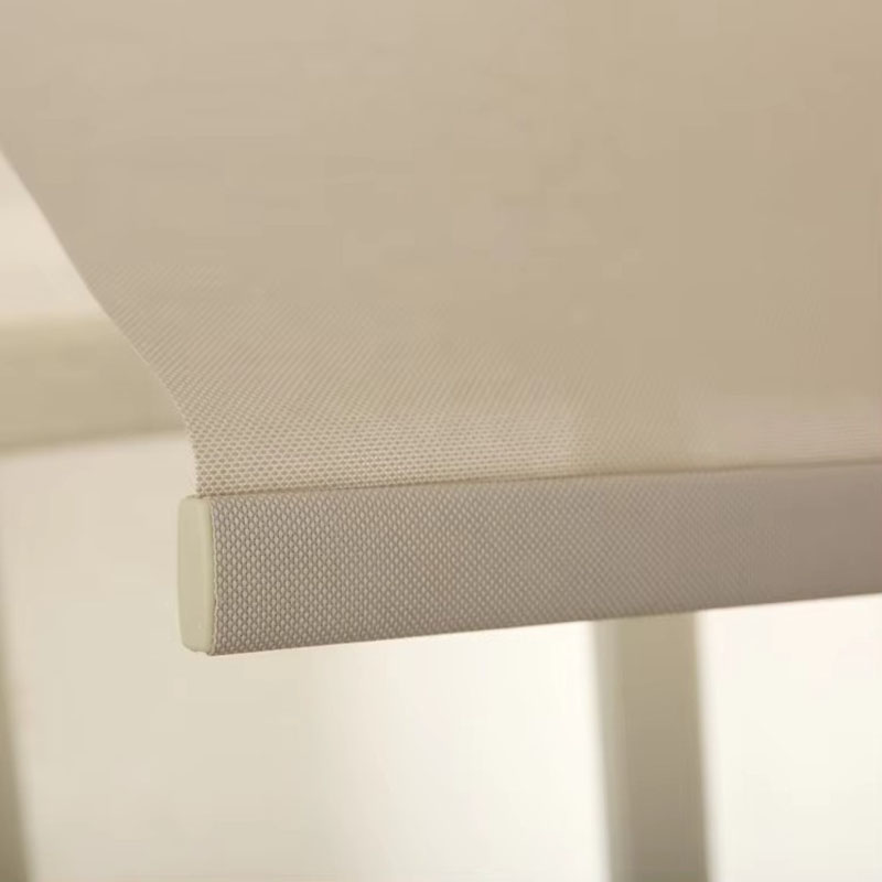 De jaloezieënstof wordt gemaakt met behulp van een nauwkeurig weefproces, wat resulteert in een fijne en gladde textuur, vrij van bramen en overgeslagen steken, met een zachte en niet-ruwe aanraking. Het oppervlak is behandeld met een aangroeiwerende coating, waardoor het bestand is tegen stof en vlekken en gemakkelijk schoon te maken is. Afhankelijk van de toepassing varieert de stofdikte van 0,3 tot 0,8 mm. De onderste halterstang is gemaakt van een massieve aluminiumlegering, waardoor een gelijkmatige gewichtsverdeling wordt gegarandeerd en het gordijn op natuurlijke wijze kan hangen, waardoor de vlakheid behouden blijft en rimpels of scheeftrekken worden voorkomen.